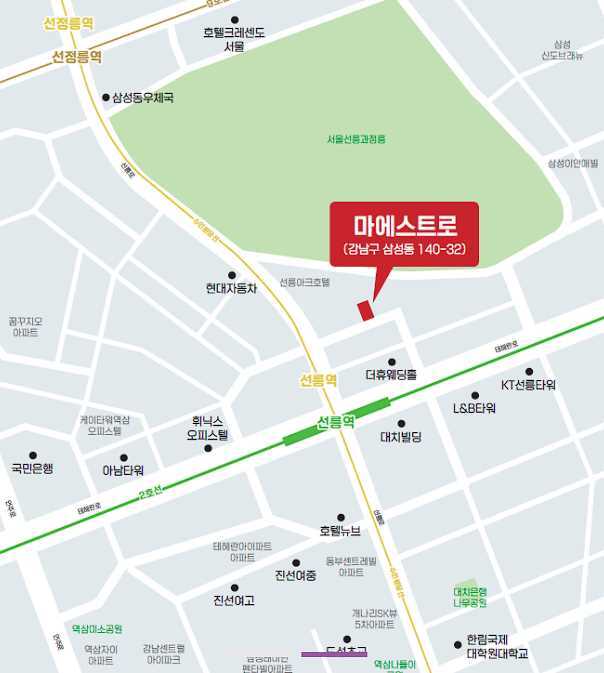선릉역마에스트로는 인근에 편의점 마트, 대학교, 공원, 카페 등 다양한 편의시설이 고루 갖춰진 지역에 위치하고 있습니다.
