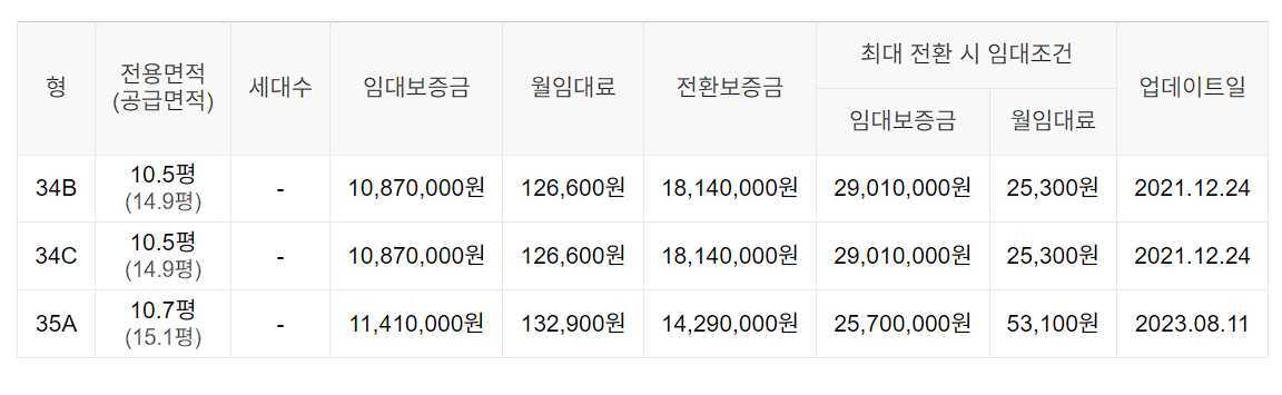 임대보증금 및 월 임대료는 입주자 모집공고일 기준이며, 보증금 최대 전환 시 변동될 수 있습니다.