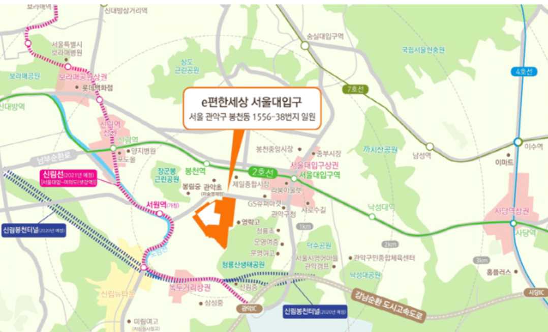 e편한세상서울대입구는 2호선 봉천역, 편의점 마트, 병원, 대학교, 공원, 카페 등 다양한 편의시설이 고루 갖춰진 지역에 위치하고 있습니다.