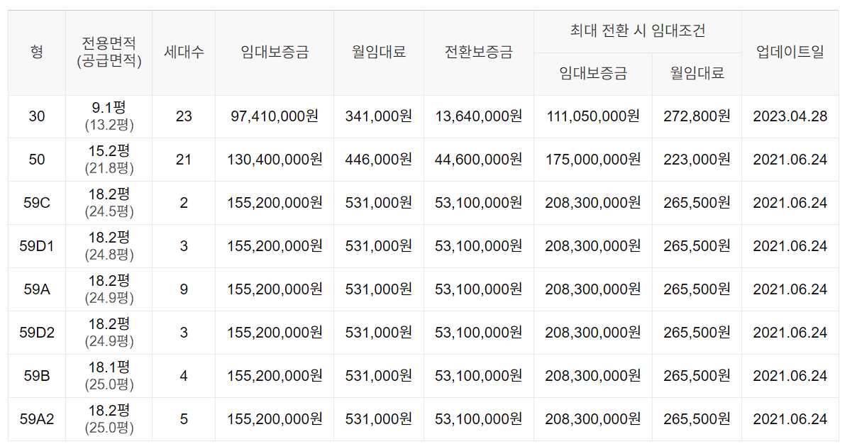임대보증금 및 월 임대료는 입주자 모집공고일 기준이며, 보증금 최대 전환 시 변동될 수 있습니다.