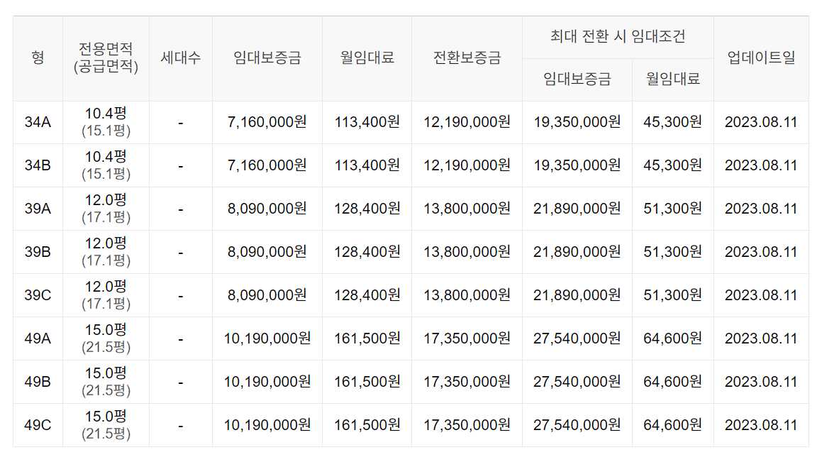 임대보증금 및 월 임대료는 입주자 모집공고일 기준이며, 보증금 최대 전환 시 변동될 수 있습니다.