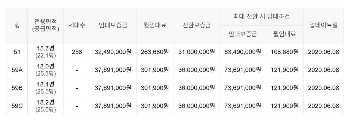임대보증금 및 월 임대료는 입주자 모집공고일 기준이며, 보증금 최대 전환 시 변동될 수 있습니다.