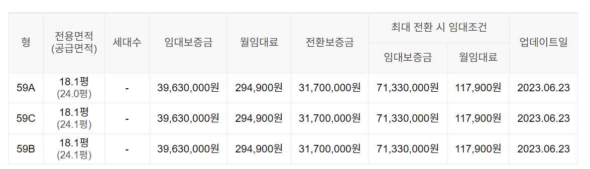 임대보증금 및 월 임대료는 입주자 모집공고일 기준이며, 보증금 최대 전환 시 변동될 수 있습니다.