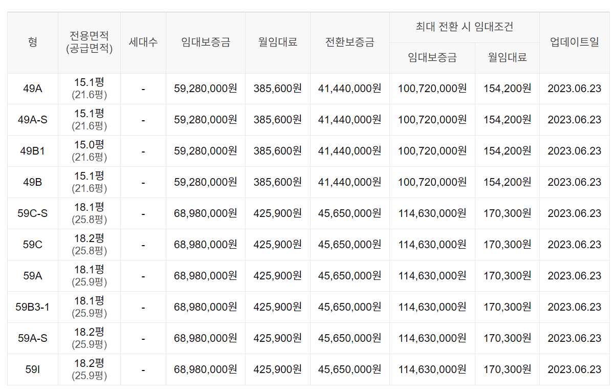 임대보증금 및 월 임대료는 입주자 모집공고일 기준이며, 보증금 최대 전환 시 변동될 수 있습니다.