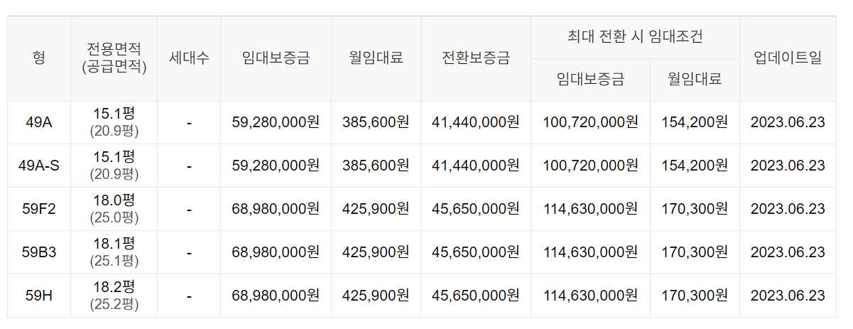 임대보증금 및 월 임대료는 입주자 모집공고일 기준이며, 보증금 최대 전환 시 변동될 수 있습니다.