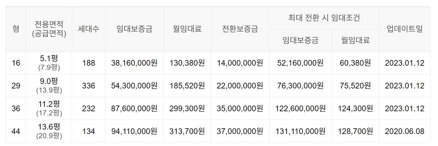 임대보증금 및 월 임대료는 입주자 모집공고일 기준이며, 보증금 최대 전환 시 변동될 수 있습니다.