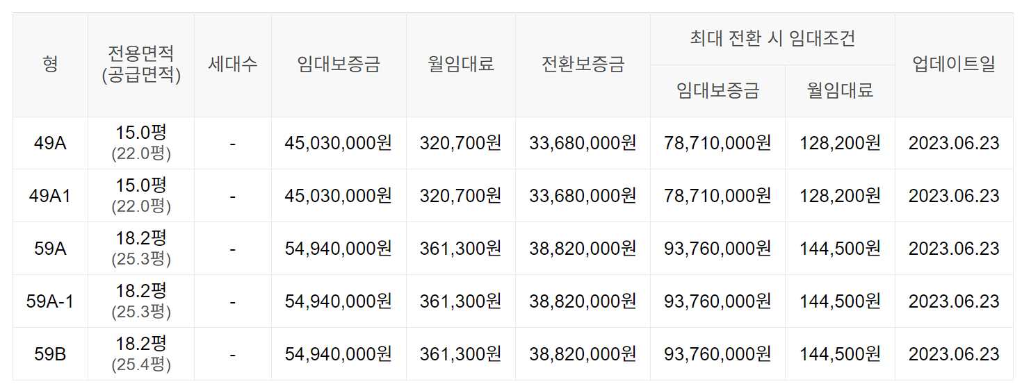 임대보증금 및 월 임대료는 입주자 모집공고일 기준이며, 보증금 최대 전환 시 변동될 수 있습니다.