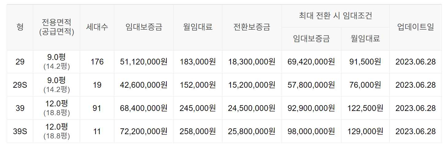 임대보증금 및 월 임대료는 입주자 모집공고일 기준이며, 보증금 최대 전환 시 변동될 수 있습니다.
