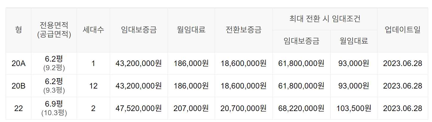 임대보증금 및 월 임대료는 입주자 모집공고일 기준이며, 보증금 최대 전환 시 변동될 수 있습니다.