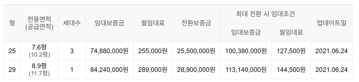 임대보증금 및 월 임대료는 입주자 모집공고일 기준이며, 보증금 최대 전환 시 변동될 수 있습니다.
