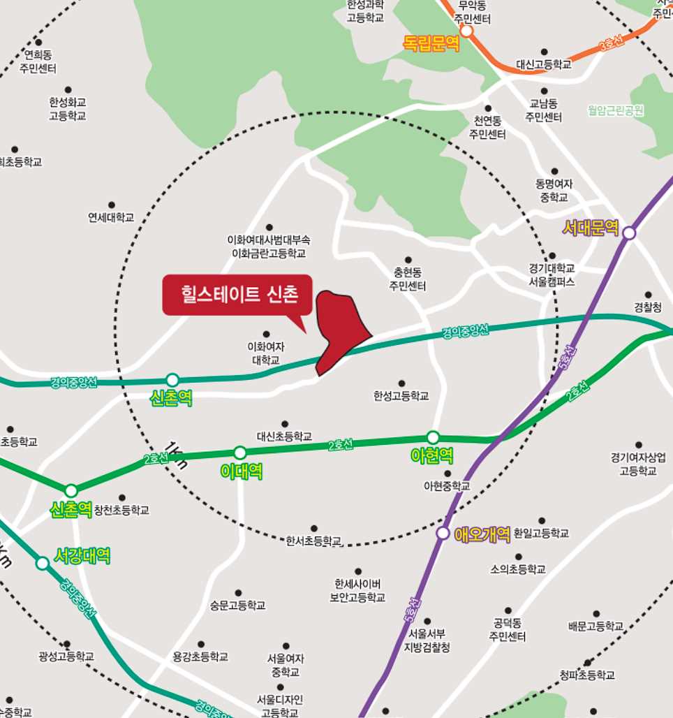 - 지하철역 경의중앙선 신촌역, 2호선 이대역, 아현역