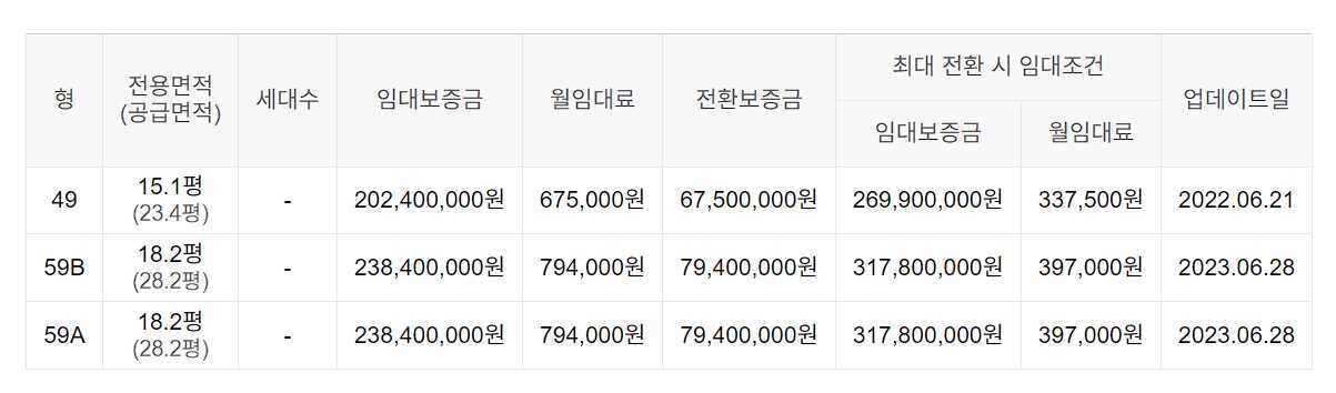 임대보증금 및 월 임대료는 입주자 모집공고일 기준이며, 보증금 최대 전환 시 변동될 수 있습니다.