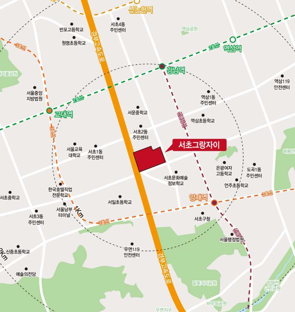 서초그랑자이는 편의점 마트, 병원, 대학교, 공원, 카페 등 다양한 편의시설이 고루 갖춰진 지역에 위치하고 있습니다.