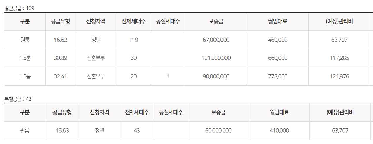 임대보증금 및 월 임대료는 입주자 모집공고일 기준으로 보증금 최대 전환 시 변동될 수 있습니다.