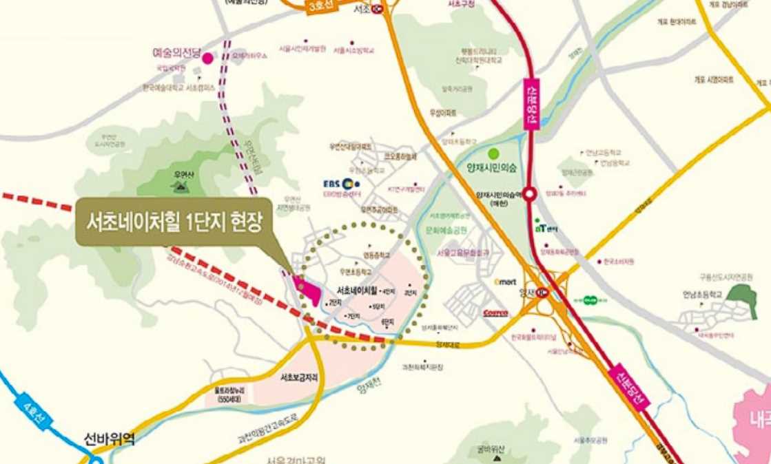 서초네이처힐1단지는 편의점 마트, 병원, 대학교, 공원, 카페 등 다양한 편의시설이 고루 갖춰진 지역에 위치하고 있습니다.