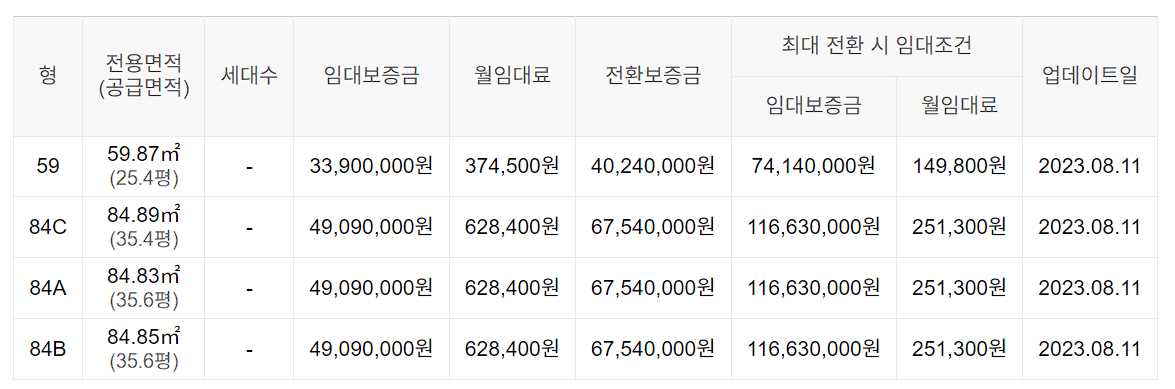 임대보증금 및 월 임대료는 입주자 모집공고일 기준이며, 보증금 최대 전환 시 변동될 수 있습니다.