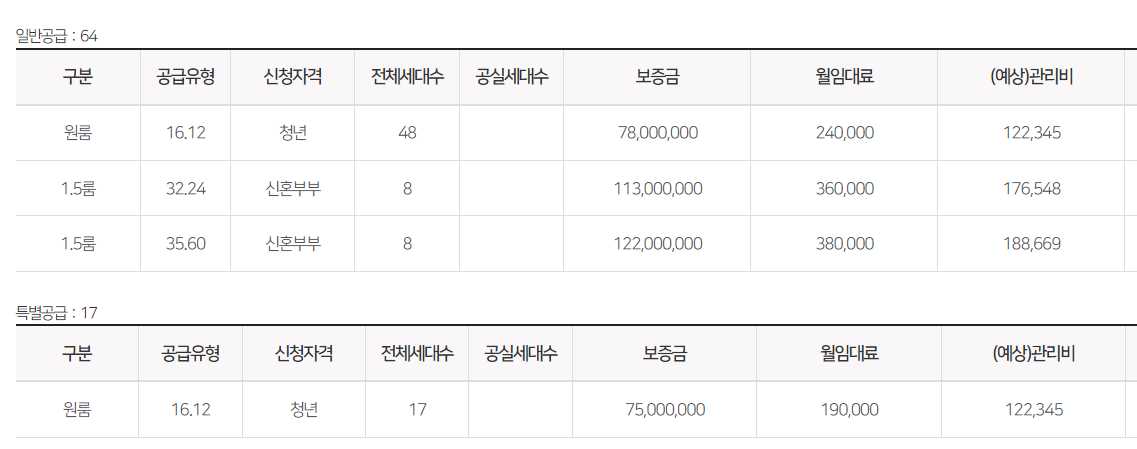 임대보증금 및 월 임대료는 입주자 모집공고일 기준으로 보증금 최대 전환 시 변동될 수 있습니다.